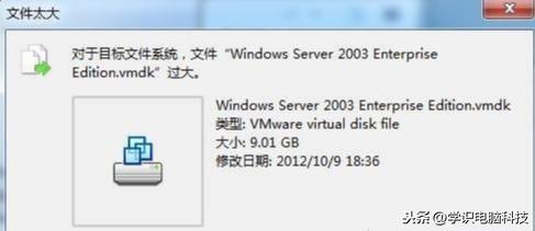 我们在拷贝文件的时候,如果文件容量超过了4GB容量大小,那么系统就会提示“文件过大”的提示,无法完成拷贝的情况,如下图所示: