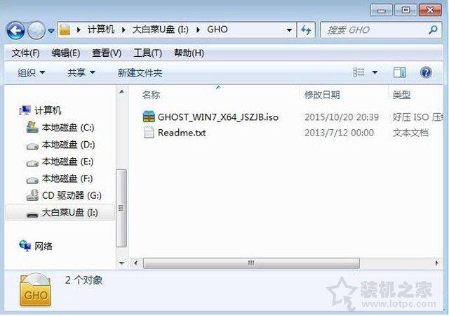 1、使用大白菜U盘启动制作工具UEFI版工具一键制作好uefi pe启动U盘之后,我们将下载好的Win7 64位系统iso镜像直接复制至U盘的GHO文件夹下,如下图所示。