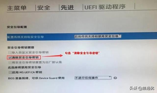 4、然后F10键保存重启后开机就要不停按ESC键进去引导项,按F10键进入BIOS设置,勾选“清除安全引导密钥”,然后再次F10保存即可,如下图所示;