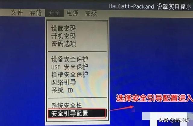 1、开机不停按键盘上F10键进入BIOS(如果没进BIOS,需要启动时按ESC键)即可进入。进入BIOS后,左右方向键切换到(安全)选项,在子菜单(安全引导配置)按回车键,在会弹出红色界面,按F10接受即可进入下一步,如下图所示;