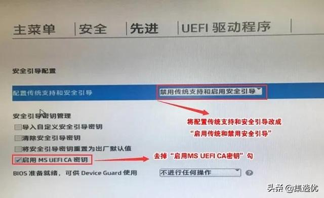 3、按回车键后,看到配置传统支持和安全引导是禁用的,需要“启用传统支持和禁用安全引导”以及去掉“启用MS UEFI CA密钥”前面的勾,然后按F10键保存,如下图所示;