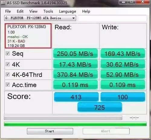 从上图左上角的第三行可以看出硬盘是否对齐。我们可以看到这个硬盘显示为31-bad,说明没有对齐。测试分为725。